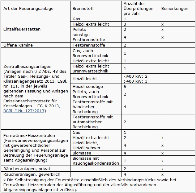 Rauchfangkehrer in Tirol sind grundsätzlich 4x im Jahr unterwegs. Wie oft der Rauchfangkehrer zu Ihnen persönlich kommt hängt von Ihrer Anlage ab. Zusätzlich zu den untenstehenden Feuerstättenüberprüfungen kommt der Rauchfangkehrer alle 5 Jahre zur Hauptüberprüfung!